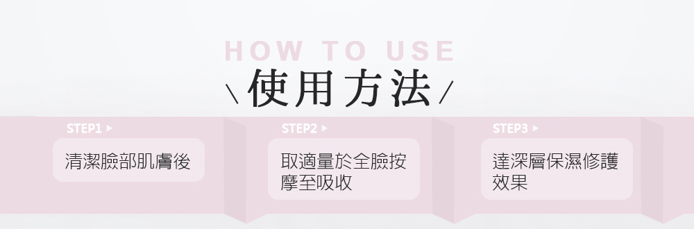 使用方法:清潔肌膚後,取適量於全臉按摩至吸收,達深層保濕修護效果。